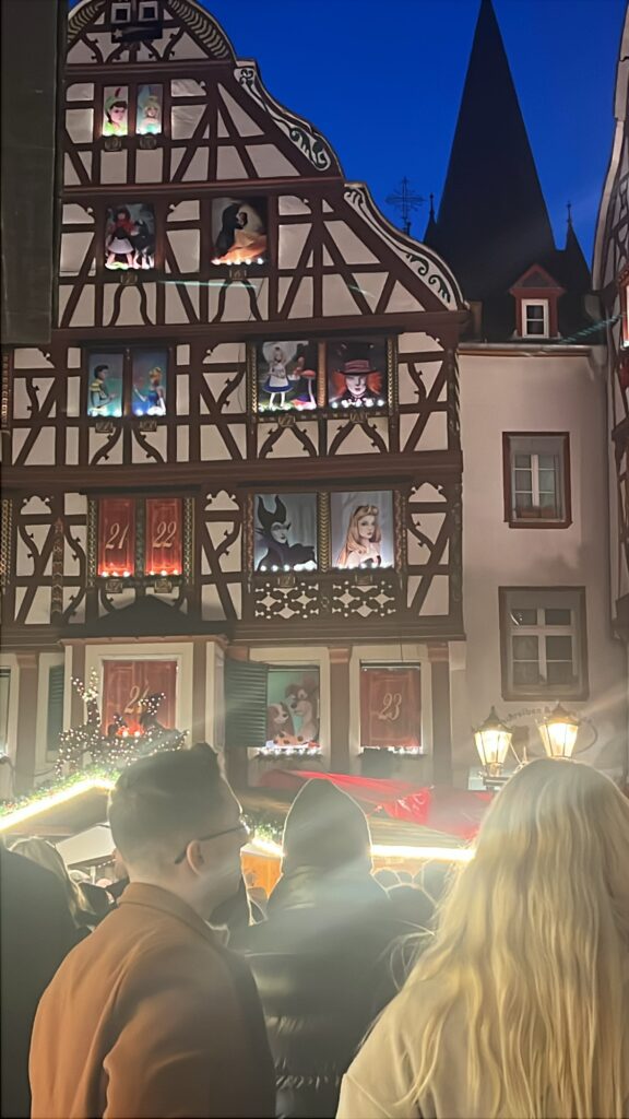 We went back out onto the streets of extremely slow walkers and made our way through back to the market Square where people were beginning to gather. There was live trumpet music which neither of us particularly liked but were made to sit through, and then at 5:30 a woman appeared at one of the windows and proceeded to tell us a story in German about a little trumpet man, a schrank (closet) and a schemas (snowman), so goodness knows what that was all about but it did go on for quite a long while before the reveal we had been waiting for happened. 21 was removed and turned around to show a sad blonde looking woman which we think might be Rapunzel. We will have to wait until 22 to see whether or not it is as those small appeared windows seem to be pairs of people. Alas, we will not find out live as we will be in the airport region, but we will have to look it up for closure.