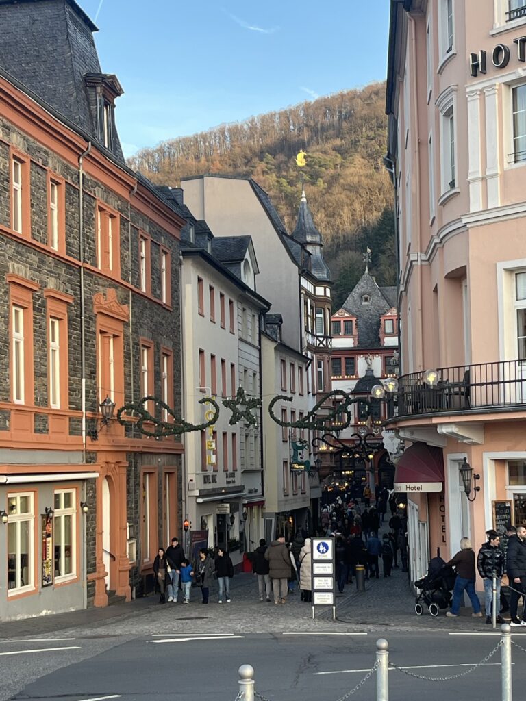 35 minutes from the offset, we arrived into BernKastel-Kues, another stunning town besides the Mosel river, with plenty of bridges, and this time, a proud castle towering over. We find parking and stroll towards a bridge which Google maps says leads into the market. We encounter some angry looking fancy geese, and their eyes looked painted in a dark red Cleopatra style, adding to the menace,honking and hollering, strutting at one another. The fear must have been apparent in my face, as a friendly old man laughs and says something indecipherable in German, but sometimes you don’t need language to understand what somebody is saying!