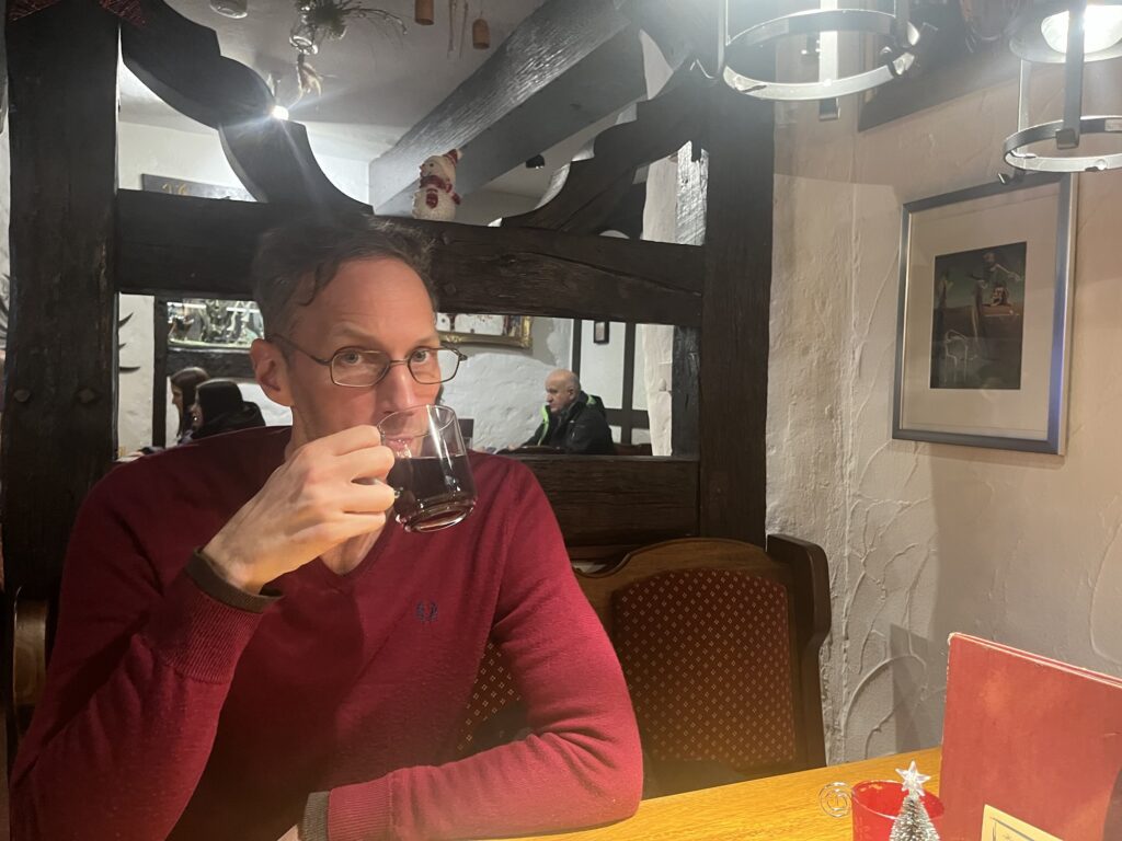 After wandering around for a few hours and exploring all the different little lanes and Christmas stands, we were trying to find space somewhere to have a sit down and a drink, eventually settling in an old stube (pub), with classic timber beams and each table had its own art piece theme! We were in Dali.