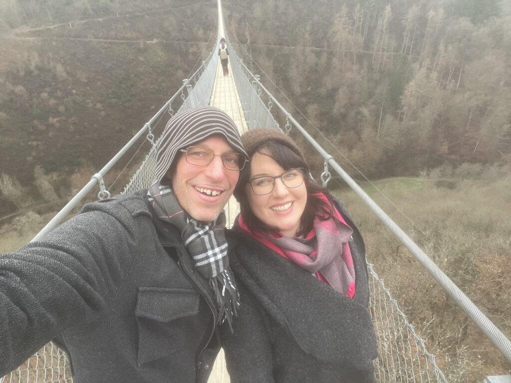 As we approached the suspension bridge, my guts dropped. Not literally. Just the sensation. Seeing the vast distance of what looked like decking hanging by thick wires, dipping alarmingly in the centre, before sloping back up to the other side of the beautiful tree filled valley, shades of evergreen and autumn rust. Gulp. I know I have to do it. So onwards. One foot in-front of the other, and a heap of trust, that’s all I needed. Through a stone entrance, Leon ahead with his whippet pace, I place my first foot on the wooden plank, total bridge width of about 1 metre wide, made of about 5 planks laid longwise, about 1.5m long each, held in huge bolts, 2 at each end of each plank. There are small gaps between the planks too, to add to the effect. I don’t let go of the thick metal rope, except to skim over each anchor point that tautly falls away diagonally into the valley below. As I approach closer to the most dipped centre point, the whole while muttering a mixture of expletives and soothing sentences to myself, I notice the gentle bouncy sway increase, and wonder if I’ll feel sea sick when I get off the other end. Sometimes, I just focus on a thread on Leon’s scarf, and other times bravely peer into to beautiful scenes of Forested nature below, that I’ve only ever seen in my flying dreams. The way back up the other side of the bridge felt extra steep, only adrenaline keeping me from stopping to grab a breath. We finally reach the other side, exhilaration that I’d done it, short lived, as I realise we either need to take a huge further 3km varying altitude hike which there are warning signs that not for inexperienced, or, cross back and take the smooth path of 1.6m. Leon takes a look along the muddy steep path that starts the hole loop, and it becomes clear, we are going back across. This time, I go first, which is somehow easier, as I can concentrate on the other end of the bridge rather than looking at the swaying planks Leon is stepping on, or over the edge. That was unexpected that going first would be easier. I can also go at my own pace instead of trying to keep up with ole long legs! I even could say I enjoyed the way back! Pure dopamine hits as I get off the start of the bridge this time, and I feel I could skip about laughing. Our wagon friend waves, claps, and thumbs ups us, wishing us merry Christmas as we jollily bound past him, reciprocating his gestures. We are plenty warmed up now and looking forward to getting back in the car, and planning to swing by an Aldi to get something for lunch (it ends up consisting of laugenbrot, which is a small pretzel bread baguette, and an oversized danish pastry style cake that only a European Aldi or Lidl can supply. Not the healthiest but it’s my birthday Boxing Day, and we did earn it!).