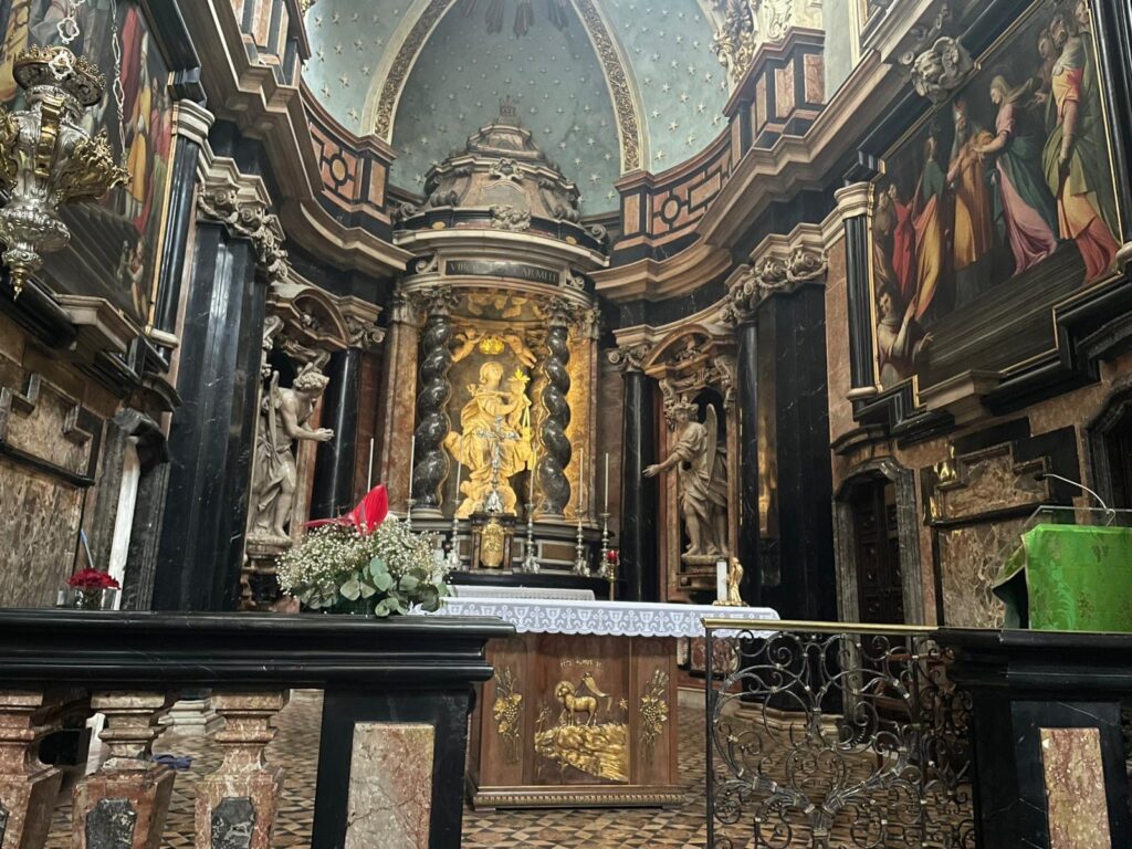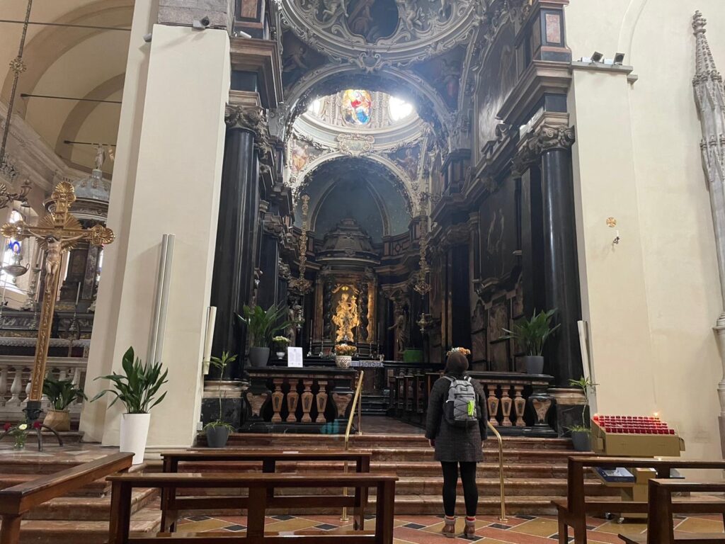 We then walked out the back of the galleria, it had 4 exits, one at each wall. After a short stroll, we found a church under renovation, draped in its own image on the outside of the scaffolding. It really was hard to tell which bits were real building through netting, and which bits were this illusion! Inside, clearly catholic, with huge silver and gold swinging incense dongs (none in today!). We enjoyed a short sit in the gothic chapel shown below.
