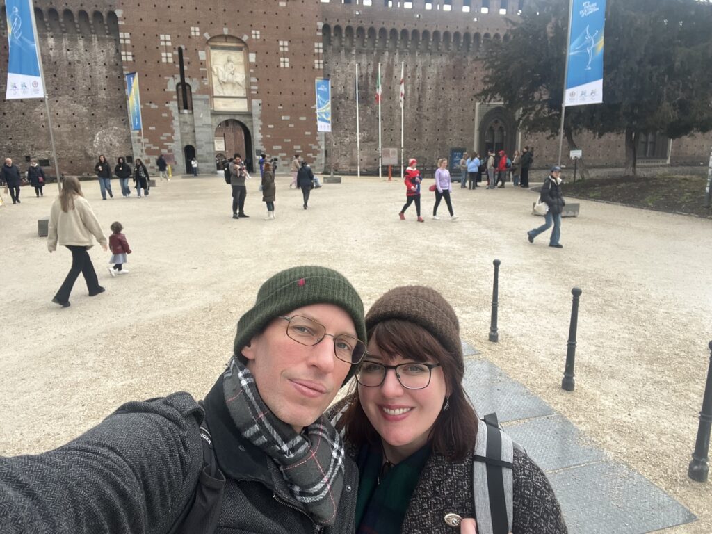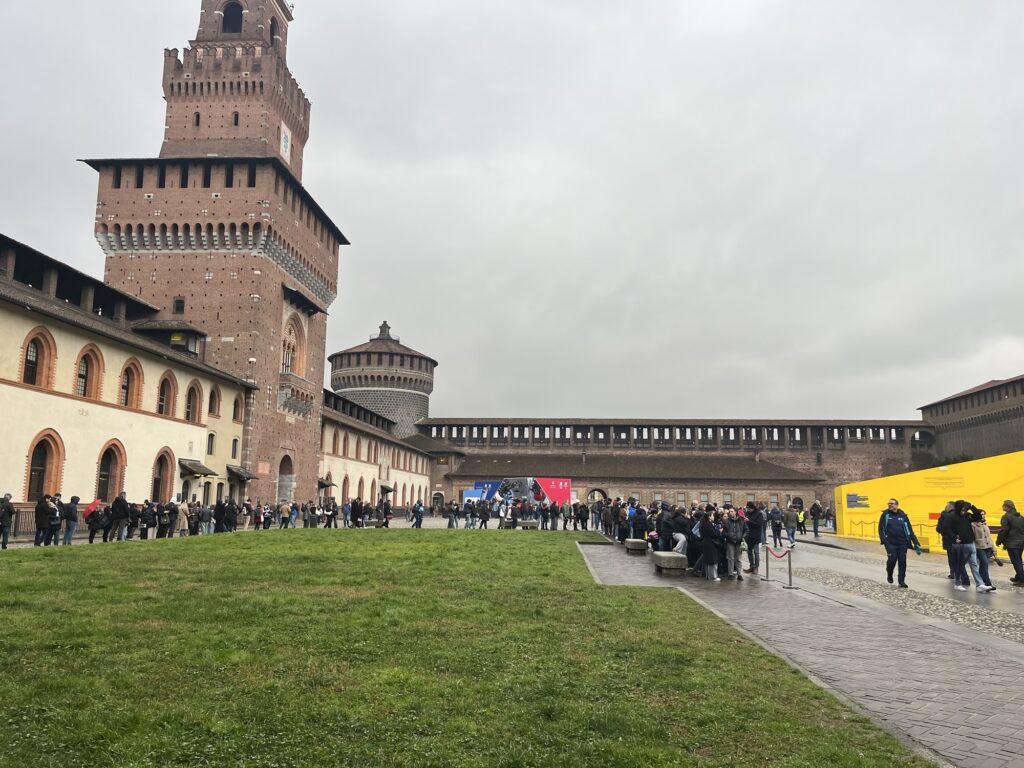 We then went to find the Sforzesco castle, which had turrets and a grassy ex-moat. Originally from 1250 and rebuilt in 1500’s. People were queuing inside to enter a garish mirrored cube, and a ginormous neon yellow set of steps. Incongruously placed in the old walls of the castle.