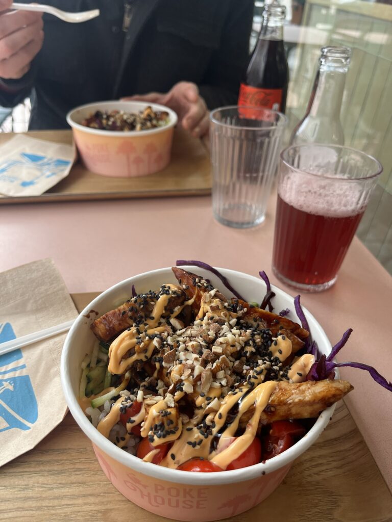 I was taking a photo of the grates on all the paths in Milan, which are a sheet drop underneath, and I wasn’t wonderfully fond of walking on them. During this photo, we happened upon Poke House, which strangely enough, sold poke! Keen for some veg and nutrition, we chose this place to get a chicken poke bowl, and Leon chose me a rhubarb and berry soda, which was scrumptious!!